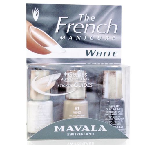 Mavala French Manicure White ranskalainen manikyyri setti sisältää ohjeet ranskalaisen manikyyrin tekoon, manikyyritarrat sekä kolme 5 ml:n lakkapulloa: valkosävyinen lakka kynnen kärkeen, kaunis pastellinsävyinen White -värilakka ja Minute-Quick-Finish -nopeasti kuivuva päällyslakka.