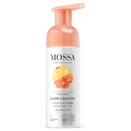 MOSSA Glow Cocktail Cleansing Foam är ett rengöringsskum för ansiktet som passar alla hudtyper och rengör huden skonsamt. Glow Cocktail Cleansing Foam innehåller extrakt av hjortron och kvitten och tar bort make-up och orenheter.