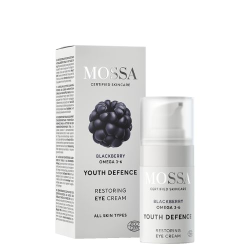MOSSA Youth Defence Restoring Eye Cream är en ögonkräm som ger näring till huden runt ögonen. Krämen innehåller björnbärsolja och absorberas snabbt av huden. Krämens omega 3-6-komplex ger huden näring och fukt.