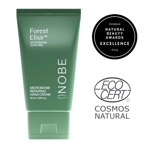 NOBE Forest Elixir® Microbiome Repairing Hand Cream är en djupt återfuktande och snabbabsorberande handkräm som stödjer välbefinnandet hos hudens mikrobiom och innehåller det innovativa Re-Connecting Nature® skogsmikrobiomextraktet.