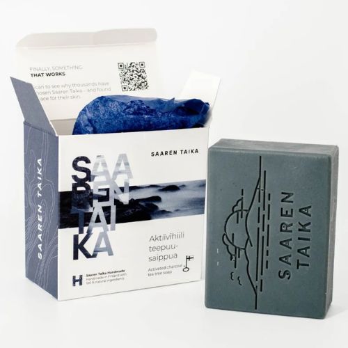 Saaren Taika Aktiivihiili Teepuusaippua on antibakteerinen ja luonnollinen palasaippua, joka sopii päivittäiseen pesuun niin kasvoille, kuin vartalollekin. Hellävarainen saippua tasapainottaa ihosi bakteerikantaa sekä auttaa hillitsemään mm. näppyjä ja kutinaa.